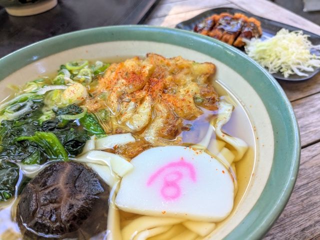 私が選んだのは「白えびかき揚げきしめん」。太くてぷるぷるした麺、ふわふわのかきあげ、そして出汁が染みたシイタケがとっても美味でした!うっかり味噌カツも追加で頼んでしまいました。