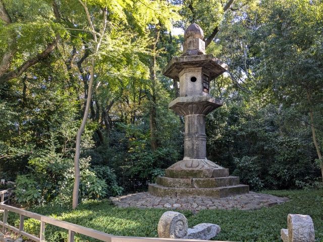 こちらは佐久間 勝之が奉納した佐久間燈籠。高さは約8mと巨大な姿。京都・南禅寺の「佐久間灯籠」、東京・上野東照宮の「お化け灯籠」とともに、日本三大燈籠の一つに数えられています。