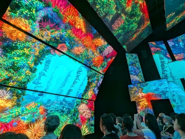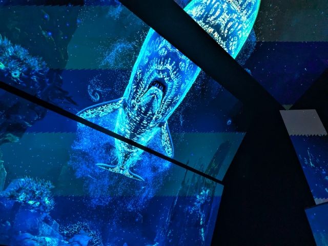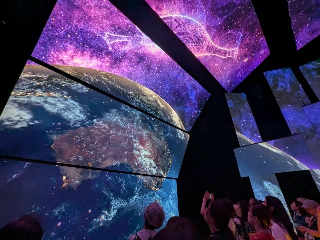 森を抜けた先はシアタールーム。4方向と天井に無数のディスプレイが連なる、独特なデザイン。スタッフさんが「前が迫力ありまーす、後ろは迫力なくなりまーす」と呼びかけているので、前の方へ。
