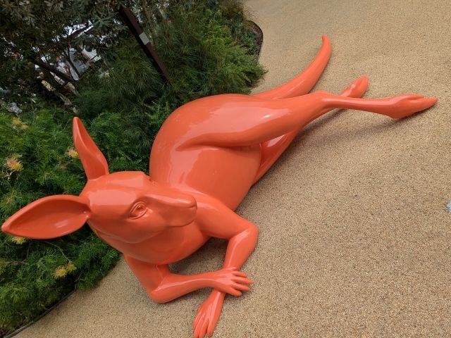 パビリオンの前に横たわるのはオレンジのカンガルー。カンガルーの寝そべりって妙にセクシーに感じますが、地面との接地面積を増やすことで体温調整したり、脚を伸ばしているのが楽だったりするそうです。