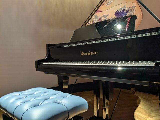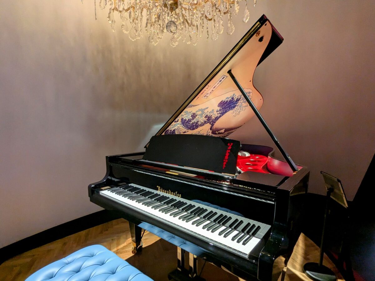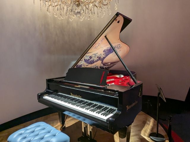 入場者を出迎えるのはグランドピアノ。1828年創業のオーストリアのピアノ工房「ベーゼンドルファー」の作品です。屋根の裏側に葛飾北斎の「神奈川沖浪裏」が描かれた、非常にレアなモデルです。
