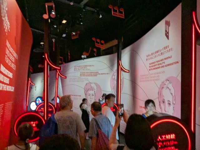 続く通路では科学者の言葉、そして最新技術の紹介コーナー。ゲーム感覚で楽しめるものもあります。音楽から離れたかと思いきや、展示パネルが音符の形であったり天井から音符が吊るされていたりと、実は続いております。