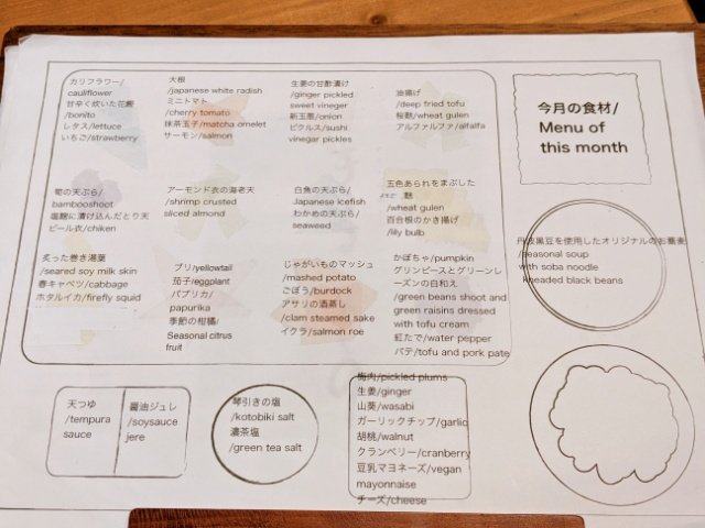 薬味もたっぷりの12種類。天つゆ、醤油ジュレ、琴引きの塩、濃茶塩、梅肉、生姜、山葵、ガーリック、クルミ、クランベリー、豆乳マヨネーズ、チーズがそろいます。組み合わせはいったい何通りあるのでしょうか。
