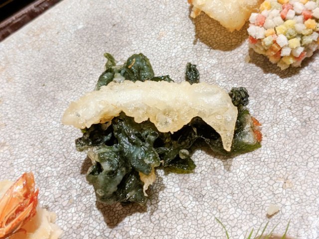 ワカメの天ぷらとその上に乗るシラウオの天ぷら。どちらも天ぷらで食べるのは初めてのメニュー。