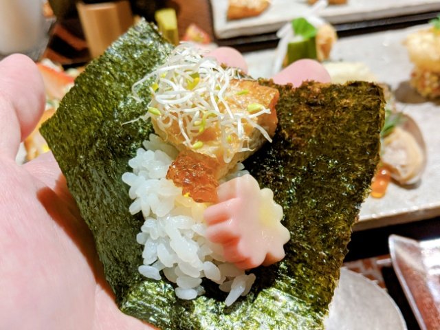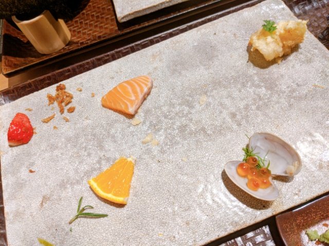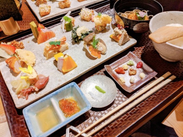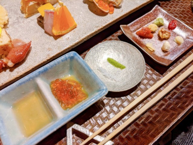 席についてしばらくすると、手織り寿司が運ばれてきました!!様々な食材が丁寧に並べられており、なんとも上品な逸品です。これは絶対に写真に撮りたくなります!!