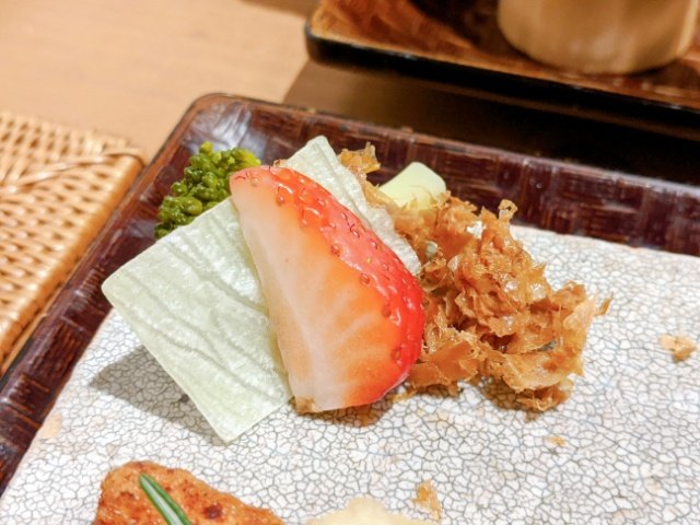 カリフラワーと花鰹とレタスといちごという不思議な組み合わせ。考えた人は、凄く柔軟な発想の持ち主ではないでしょうか。そして、レタスをこんな四角く切るのはとっても斬新です。