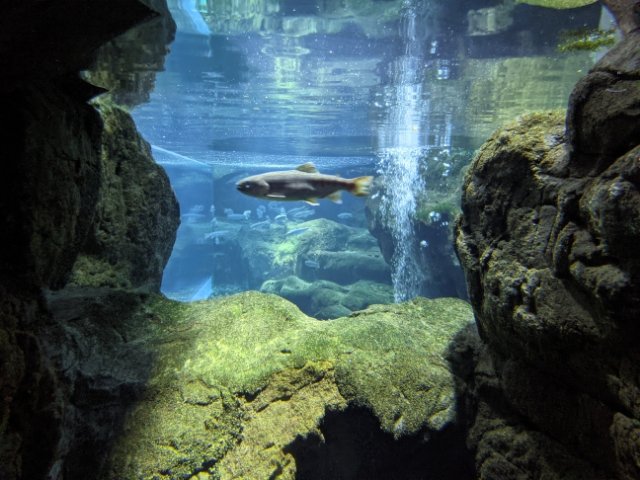 岩場もつくられており、まるで本当に水中に潜っているような気分。水のブルーとコケのグリーンがあまりにも美しく、まるでCGかのようです。