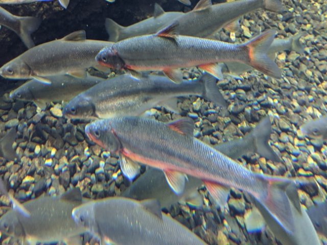 群れているのはウグイ。安曇野で最も多いサカナで、高所から平地まで生息範囲もかなり広いそう。産卵期になるとオスメスともに赤く染まるため、長野県では「アカウオ」とも呼ばれています。