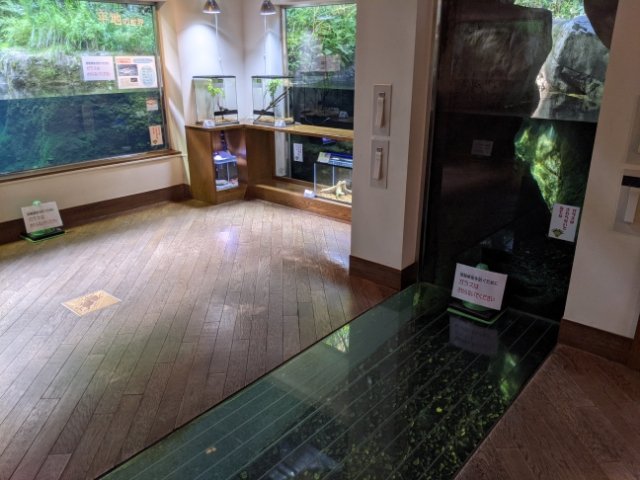 中には壁と床が繋がっている非常に凝った水槽も。先ほどのあづみの水槽もこちらも、共に観察窓タイプの水槽。屋外に作られた池を観察できるようになっており、リアルな水中世界を覗き見ることができます。