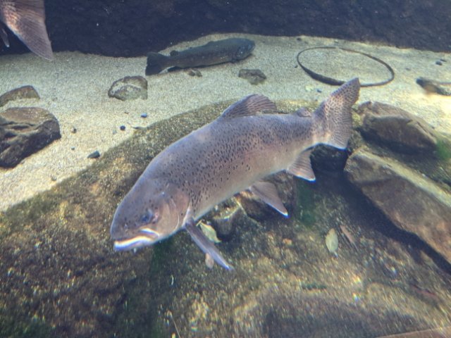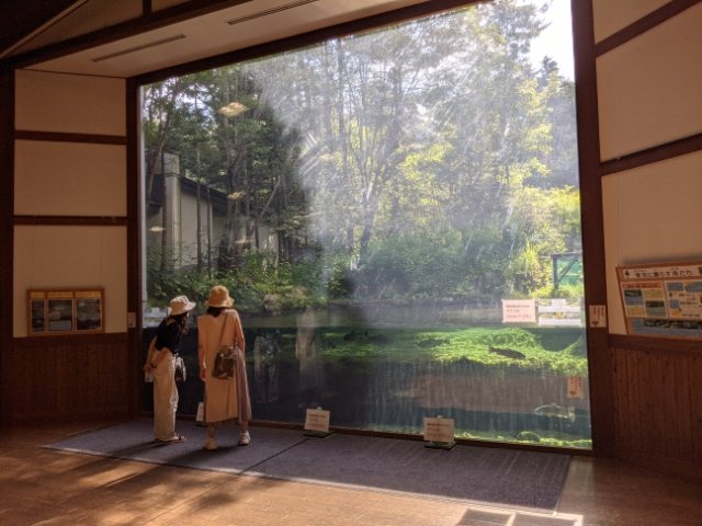 目を引くのは、入館してすぐのところにある安曇野の里山をイメージしたあづみの水槽。大きなガラス窓の向こうには、ニジマスやブラウントラウトが泳ぐ池が広がっています。