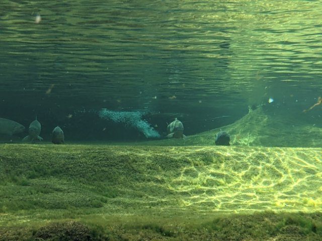 ここの展示のポイントは、なんといっても水槽の美しさ。その多くが屋外の池であるため天候にも大きく左右されますが、晴れて日が射すとこんなに美しい水中世界に。