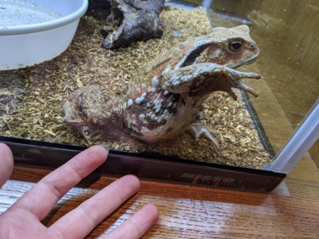 巨大なアズマヒキガエル。いわゆるガマガエルでそれほど珍しい生き物ではありませんが、ここの個体はサイズがかなり大きい!片手ではこぼれそうなほど立派です。