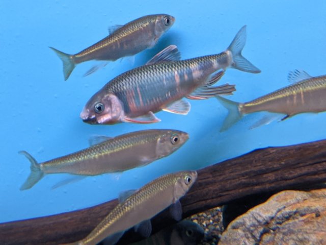 色鮮やかなオイカワ。赤と青の色合いは産卵期に婚姻色に染まったオス。長野県では、「ジンケン」と呼ぶそう。漢字にすると「人絹」となり、レーヨンのことを指すらしい。