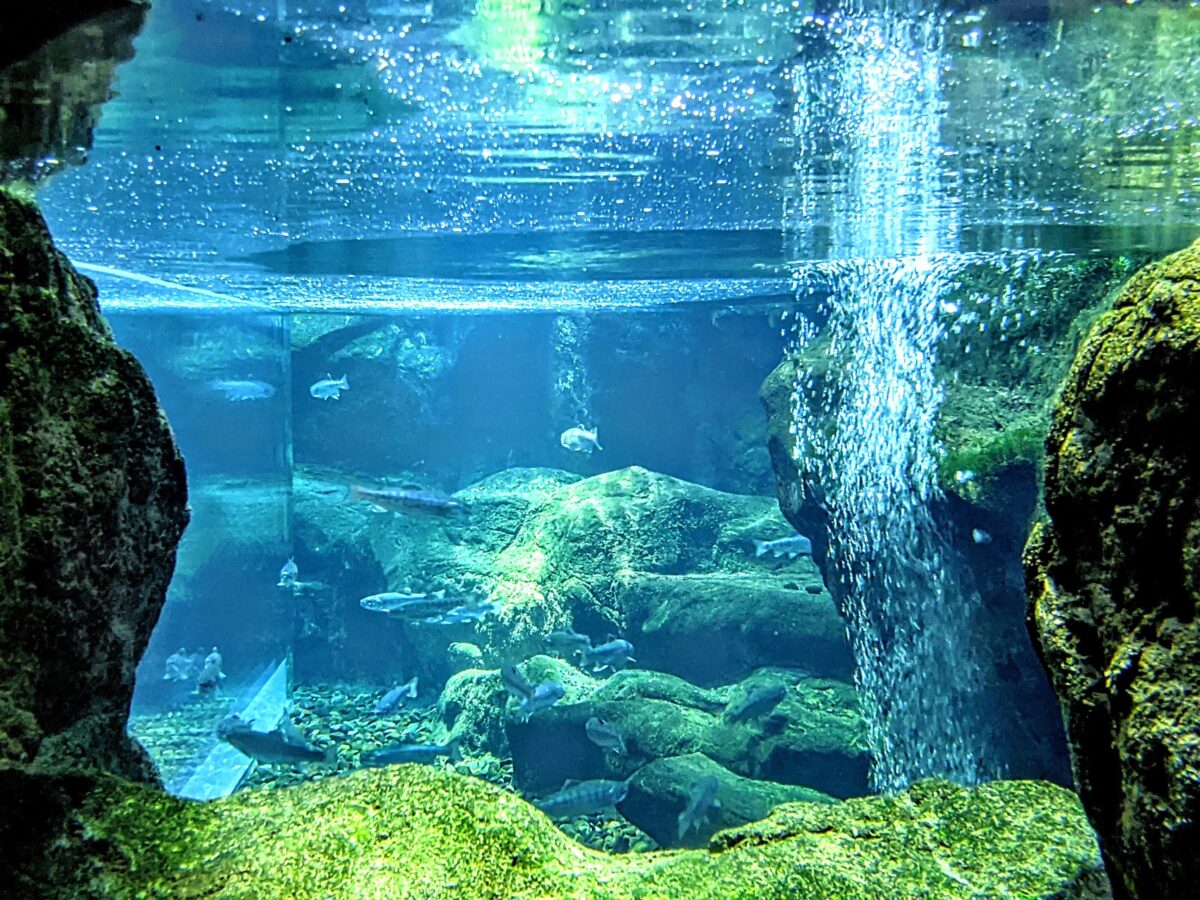 岩場もつくられており、まるで本当に水中に潜っているような気分。水のブルーとコケのグリーンがあまりにも美しく、まるでCGかのようです。