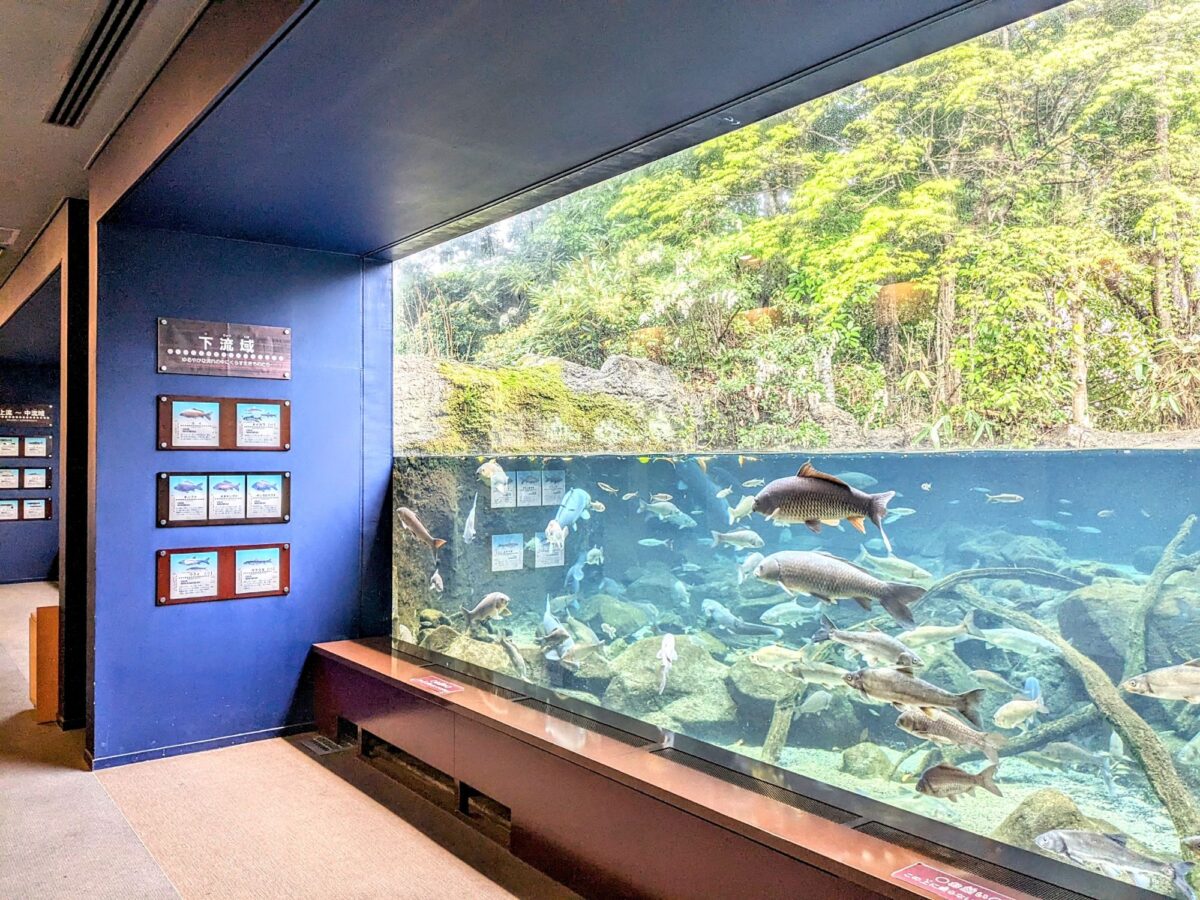 こちらの大きな水槽は、番匠川を再現した水槽。上・中流と下流域と2つに分かれています。