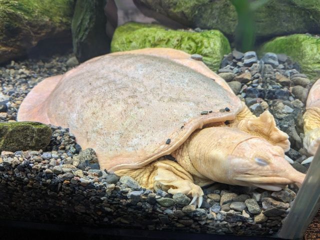 一方、こちらは黄金色のスッポン。アルビノかと思いきや眼が黒いため色素異常によるものであるそう。金色の亀なんてとっても縁起が良さそうですね。