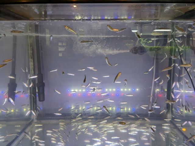 LEDライトでキラキラと輝く「メタル・フィッシュ」。その正体は「ハク」と呼ばれる2~3cmのボラの幼魚。