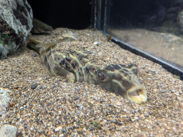 砂にもぐる不思議な姿は、淡水フグのテトラオドン・リネアートゥス(ファハカ)。ヒラメやカレイなら普通ですが、フグが潜るというのは不思議な光景。どうやって潜るのかが気になります。