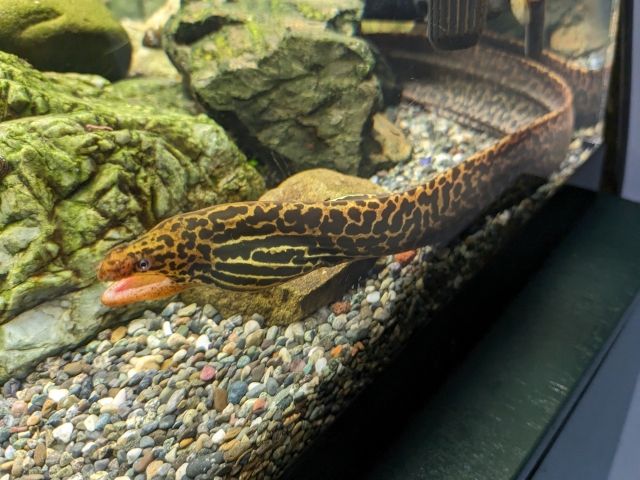 こちらはコクハンカワウツボ。淡水まで遡上するという珍しいウツボ。近年、八重山諸島の西表島でも発見されたそうです。