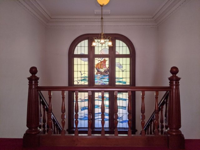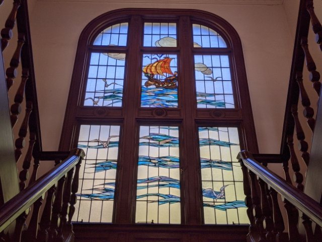 階段の踊り場にはあざやかなステンドグラスが施されています。太陽の光を吸収して輝く姿に思わずうっとり。大海原を進む帆船が描かれており、日本とフランスを行き来した伯爵が思いを馳せていたと考えられています。