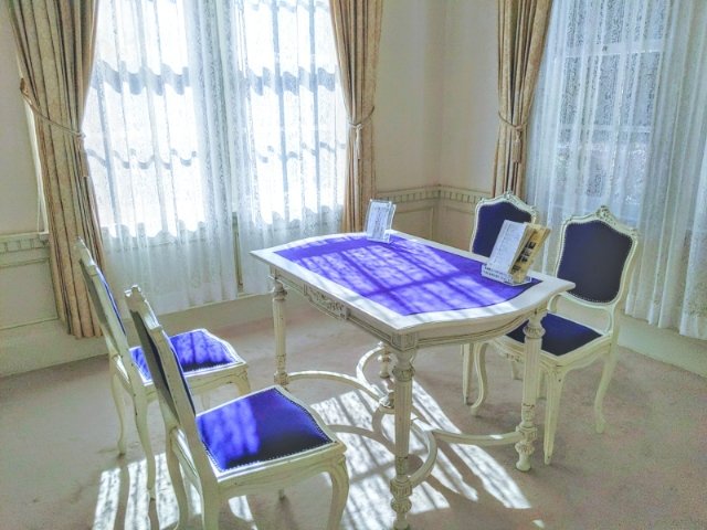 白く輝く姿が印象的な洋館。館内へ足を踏み入れると、ステンドグラスやシャンデリアといったインテリアを存分に堪能することができます。豪華でありながらも洗練されており、非常にエレガントな建築です。