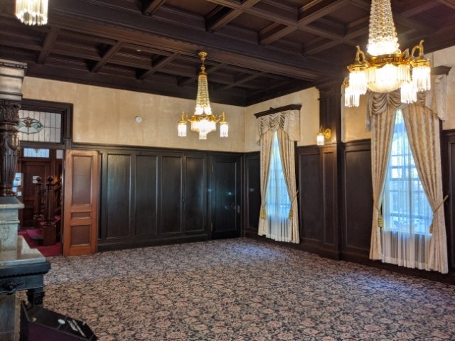 入口すぐ右手にある謁見の間。漆喰のホワイトをベースに、金色の装飾がゴージャスなお部屋です。ここは、久松伯爵が後に昭和天皇となる皇太子様に謁見した場所とのこと。