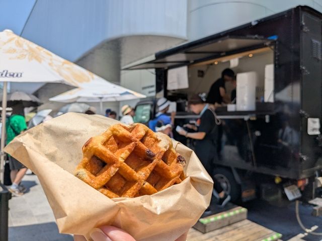 ここで食べられるのは、リエージュワッフル。サクサク、ジャリジャリとした食感に、コンデンスミルクみたいな風味も感じる超絶品です!