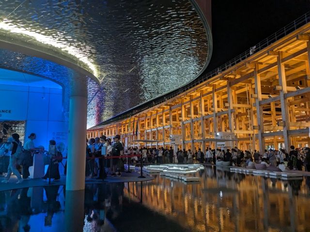 待機列からはパビリオン前の水辺に反射する大屋根リングが見れます!「逆さ大屋根リング」とも呼べそうな美しい姿にうっとり。