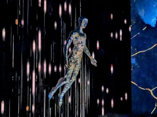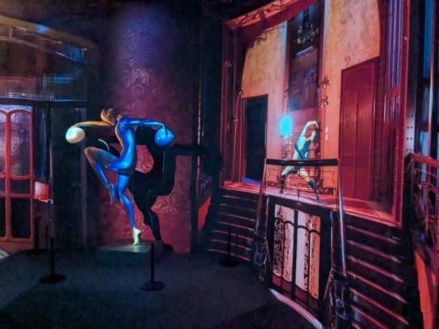 最後の部屋では、マネキンは2つの球体を持った躍動感あふれる姿。義肢の紹介から、壮大な音楽とともにマネキンが飛び回る。