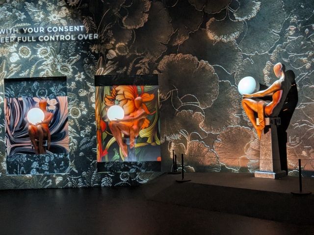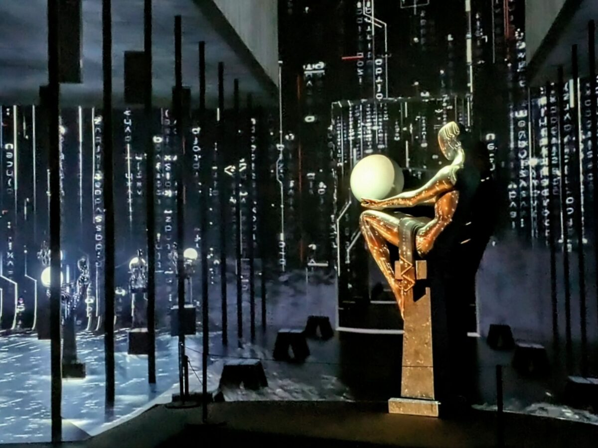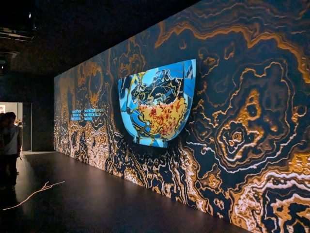 最後の部屋で流れる5つ目の映像は、四季を通じて生命の神秘を語る壮大なもの。最初のスクリーンにいたマネキンは、円を掲げたスタイルで再登場します。