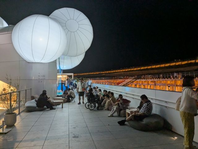 夜になると、前面がスクリーンに!ときおり映像が流れたり、カラフルにライトアップしたりと、見ていて退屈しません。
