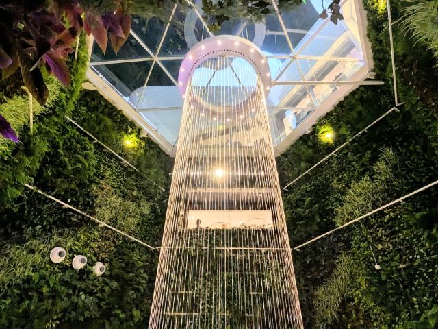 次の部屋では、壁一面が緑に包まれた空間。天井から円形に水が降り注ぎ、ビオトープのような爽やかさ。アンビエントな音楽が流れ、心が落ち着きます。