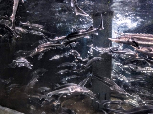 内部は2部屋だけの小さな水族館。最初の部屋には円形の水槽があり、そこにはチョウザメどっさり。