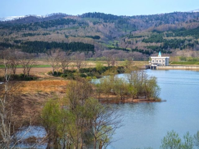 よく見ると、湖畔に古城のような建築物が見えます。詳しくはわかりませんが、どうやら天塩川に繋がる水門とその管理施設のようです。道の駅やチョウザメ館と同様にロマンチックな雰囲気の建物です。