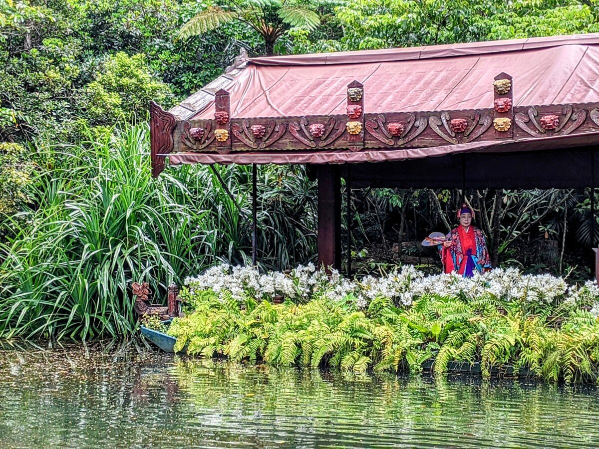 このビオスの丘の名物アトラクションが湖水鑑賞舟(こすいかんしょうせん)。船頭さんの楽しいガイドに耳を傾けながら、園内の池を進んでいくリアルジャングルクルーズです。