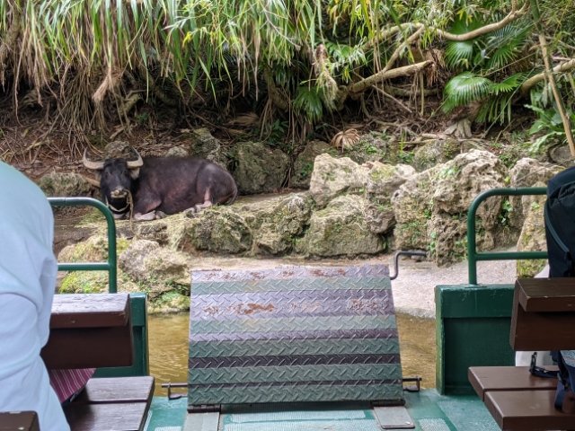 終盤、入江のような場所へと入り込んでいくクルーズ船。そこにはなんと水牛がかまえていました!かつては農業に従事していた水牛ですが、機械化が進んだ今では観光がメインのお仕事。この水牛はモデルとして働いているそうですが、まるで置き物のように微動だにしません。
