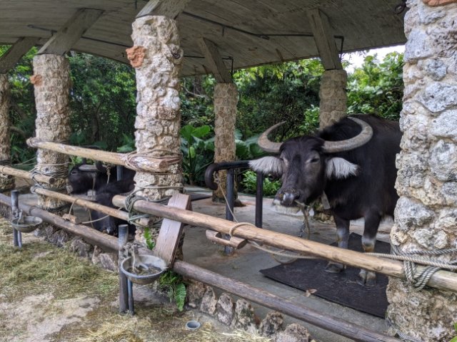 立派な角をもった水牛もいます!もともとは台湾より持ち込まれたと言われていますが、すっかり沖縄のイメージになじんでいますよね。1,200円で水牛車に乗車して園内をゆったりとめぐることもできます。(※2022年3月時点では休止中)