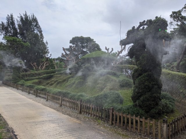龍の姿に刈り込まれた「龍のトピアリー」。トピアリーというのは刈り込みで作られた造形物のことです。この龍はただの刈り込みではなく、仕掛けがあります。眺めていると、突然目が光り出しました!そして、口からはミストを吹き出します!