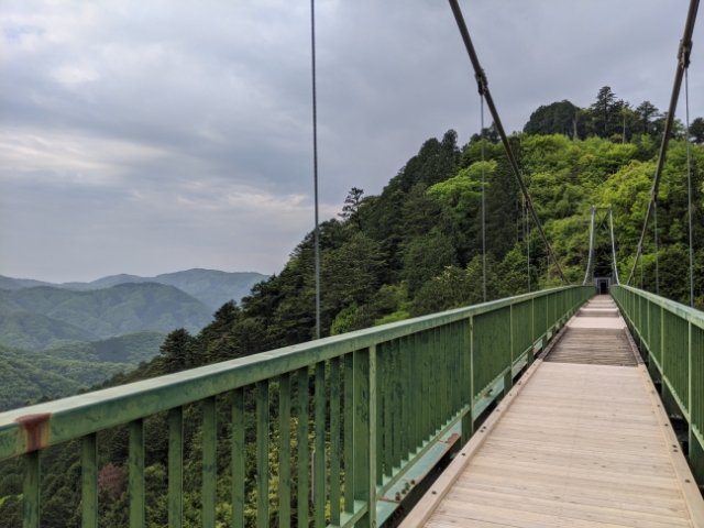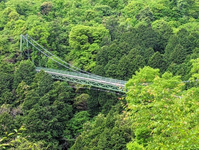 10分ほどで大松山吊り橋が見えてきます。グリーンが美しい吊り橋です。
