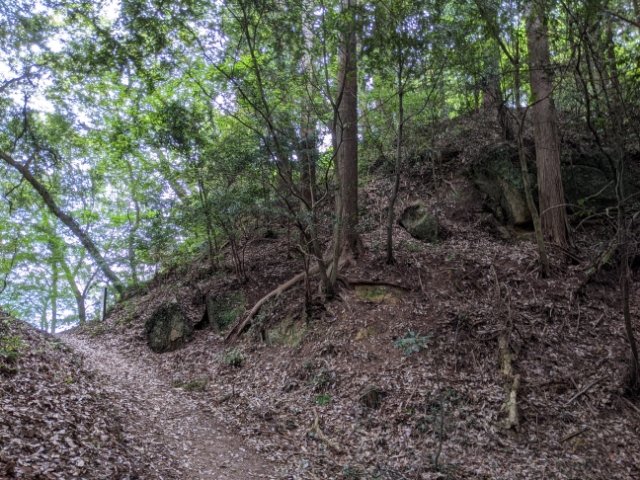 一見するとなんてことない山道ですが、ここは天神の丸跡。右が本丸、間の堀切を挟んで左が出丸と考えられています。なお、ここが臥牛山の最高峰とのこと。