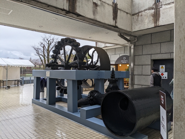 地下一階にはベルトをかけて発電機を回して電気を生み出していたペルトン式水車などの屋外展示も。さらにはテラスが広がり、春と秋の期間限定でそすいカフェも営業しています。