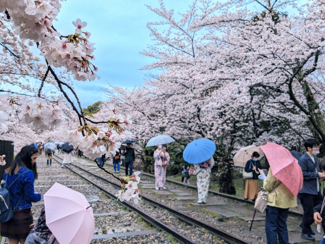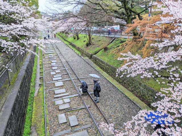 サクラの名所としても知られており、春に訪れるとレールの両サイドを華やかなサクラの花が彩ります。撮影スポットとしても人気で、雨の日にも関わらず多くの人であふれていました。