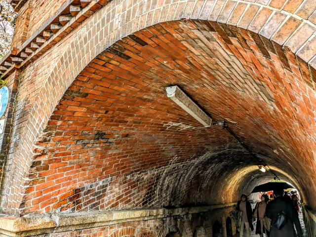 蹴上インクラインの真下を横断するために作られた歩行者用のトンネル。ねじりまんぽというのは、「ねじりのあるトンネル」という意味とのこと。レンガ造りのトンネルですが、その名の通りねじれるように積み上げられています。