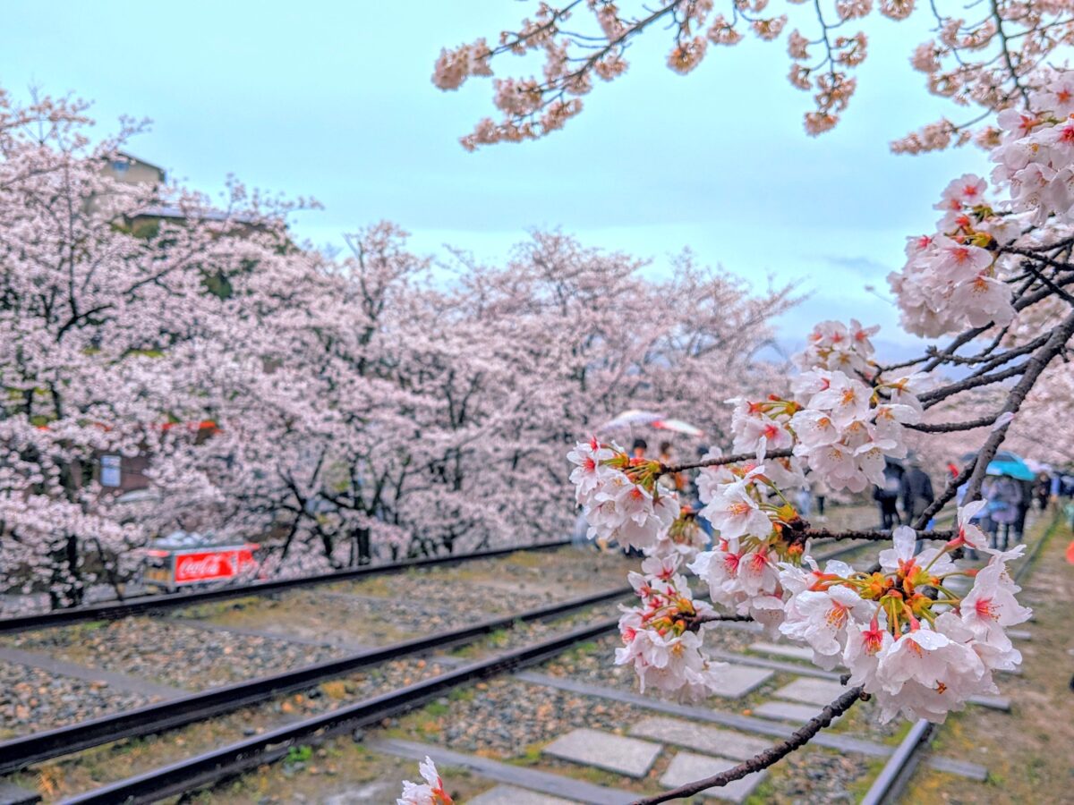 サクラの名所としても知られており、春に訪れるとレールの両サイドを華やかなサクラの花が彩ります。撮影スポットとしても人気で、雨の日にも関わらず多くの人であふれていました。
