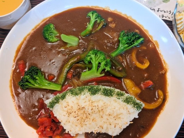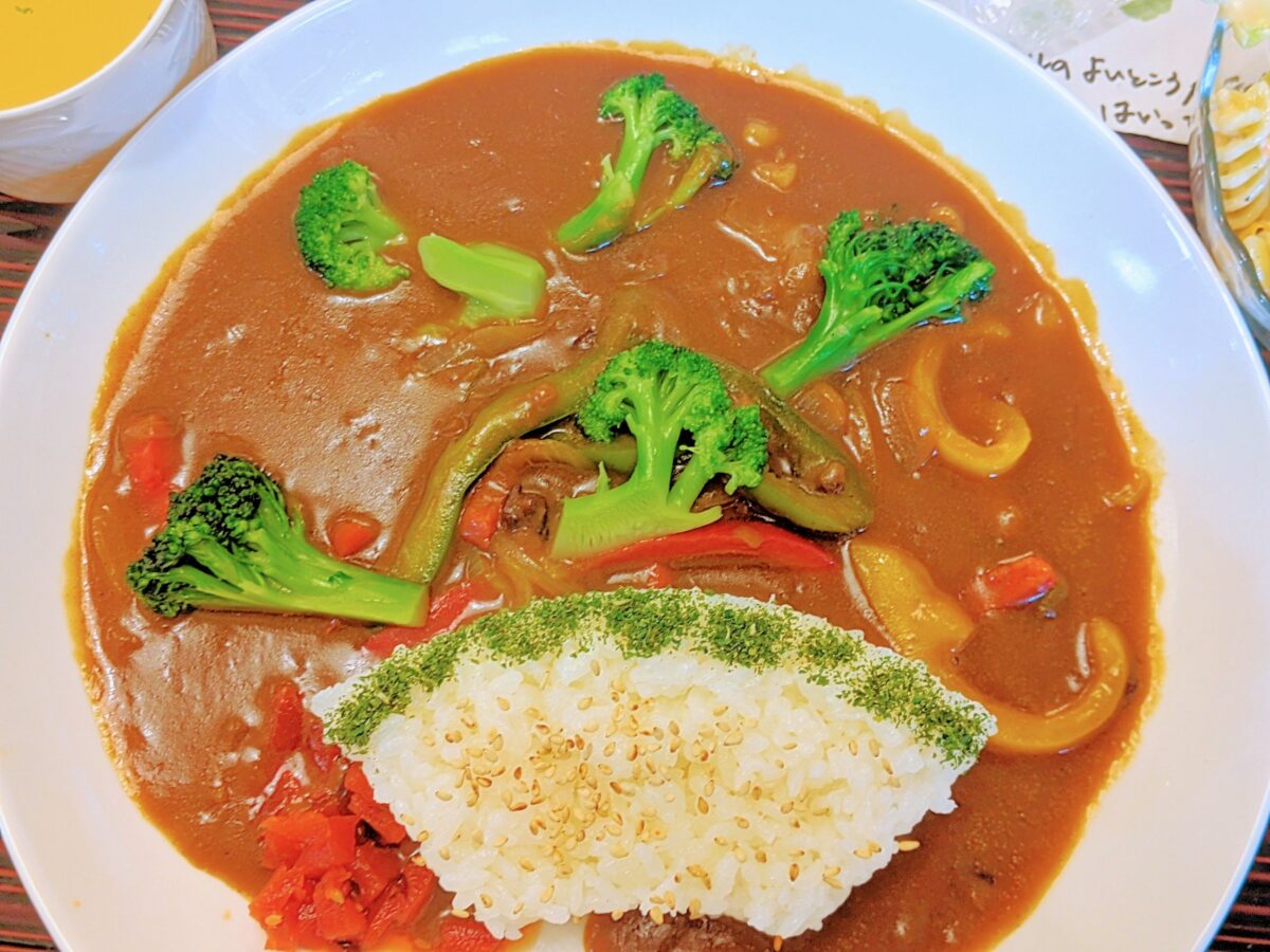 甘口でスタンダードなカレーですが、野菜たっぷりなので食感が楽しい。ご飯に振られた青のりとゴマが不思議なアクセント。普段カレーではあまり見かけないトッピングなので、風味がとっても新鮮です。