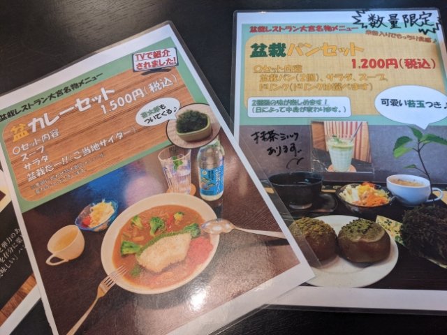 メニューはハンバーグ定食やカレーライス、静岡県で水揚されたしらすと桜えび丼など美味しそうなラインナップがそろっています。盆栽らしいメニューとして、「盆カレーセット」と「盆栽パンセット」を見つけました!