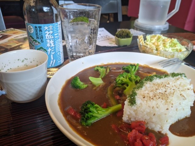 カレーの他にはサラダとスープ、そして「大宮盆栽だー」が付いてきます。ストレートすぎる名前が示す通り、盆栽とサイダーをかけた炭酸飲料です。さいたま市のご当地ドリンクとして2012年に販売開始されました。