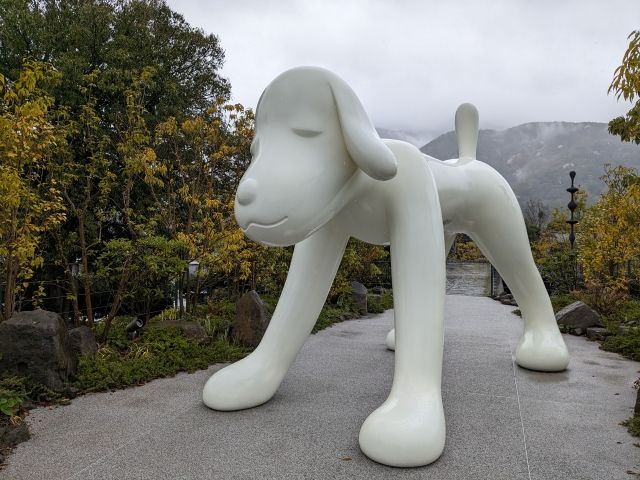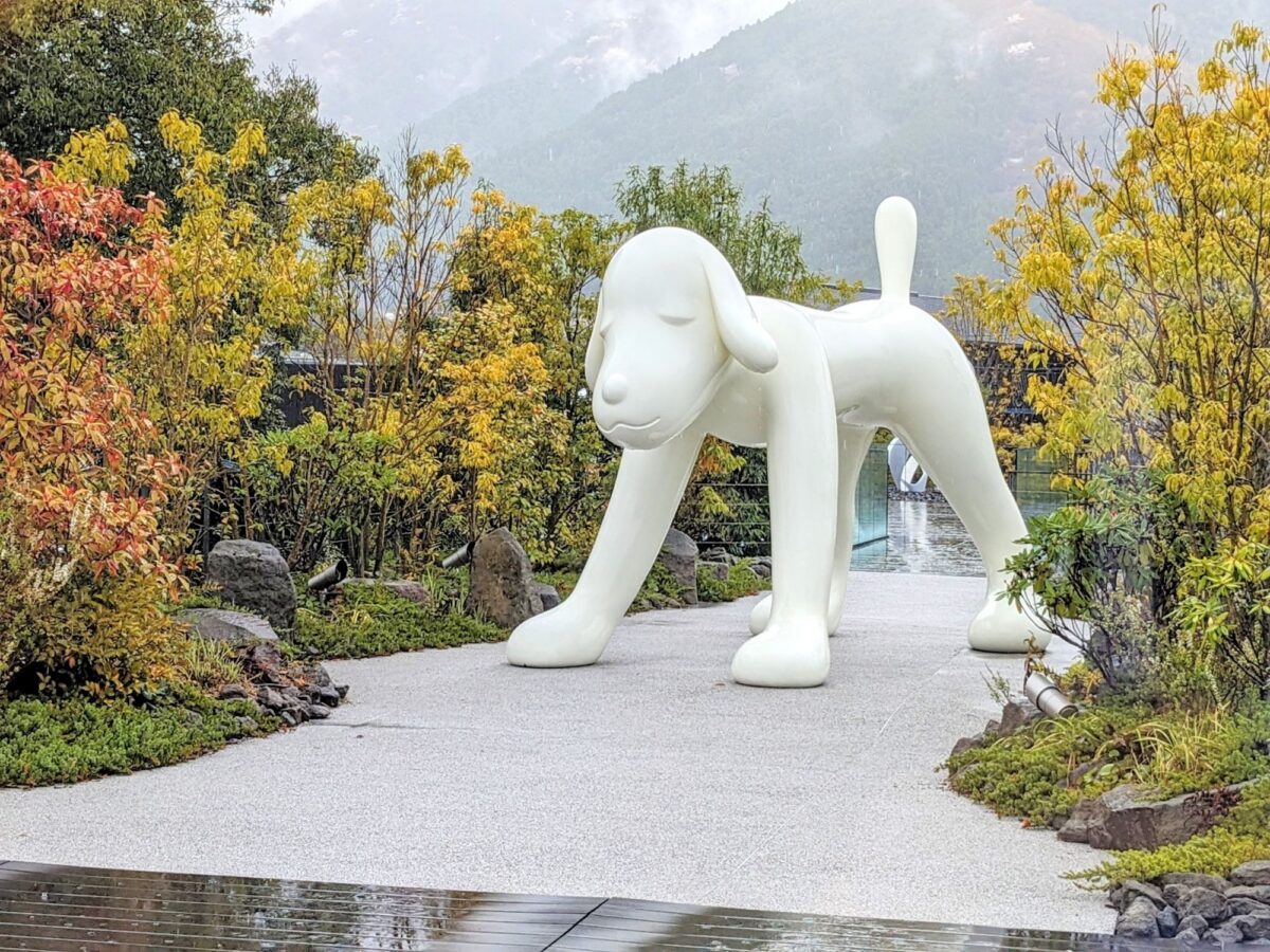 展示は2階の屋外エリアにも続きます。来館者を出迎えるようにたたずむのは、奈良 美智の《Your Dog》。青森県立美術館の「青森犬」でもおなじみの真っ白なイヌ、ココにもいたのですね。