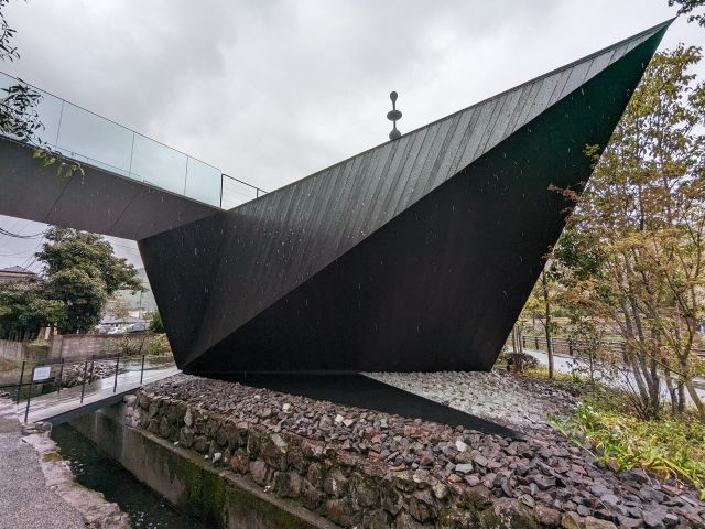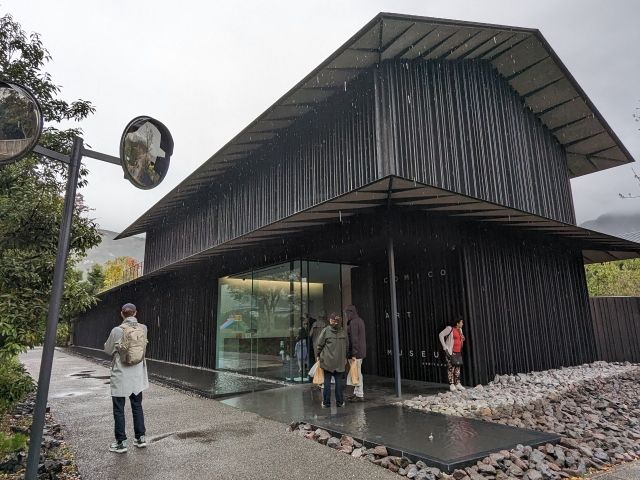 この美術館の建築を担当したのは、世界的な建築家である隈研吾。彼の作品といえば、木材が積み重なるデザインが著名ですが、この建物は全面が真っ黒。これは「焼杉」という素材が使用されています。
