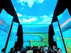 巨大な階段状の建築が目を引くパビリオン。館内には深いブルーの海中世界が広がっています。多様な生き物や、交易など、様々な恵みをもたらす黒潮をテーマにした展示は見応えたっぷり。後半に登場するオレンジの部屋もインパクト抜群です!
